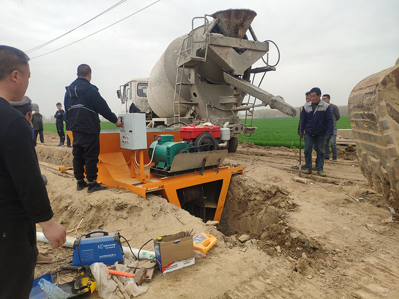 牽引型水渠機可以直接使用罐車拉料,也可以使用自拌料。推擠使用罐車上料,來自于商混站的混凝土強度能夠達到甲方的要求,而且出來的成型面更加細膩光滑。